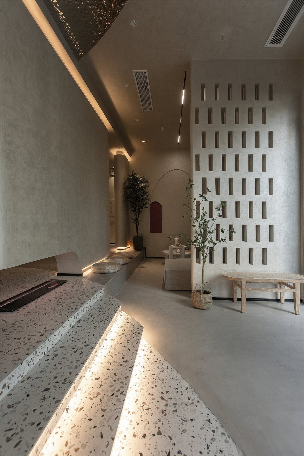 休息区,水泥灰的简练基调,能让客人感受到时间的静谧,在短暂的停留里更有一番耐心来感受美的沉淀与力量。