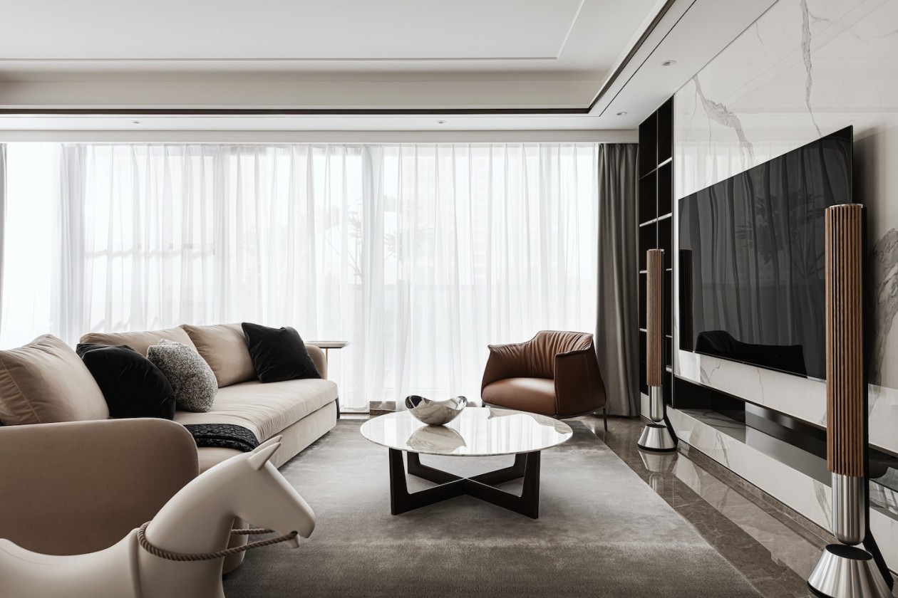 在不改动室内已有墙体的基础上,设计师选择加入适量独特造型、质感细腻且丰富的软装产品,意在营造一种个性独立又极具包容性的居住空间,并赋予空间浓郁的艺术感。同时,增大储藏面积,提高收纳率,满足业主良好的居住生活体验,提升其居住认同感和幸福感。