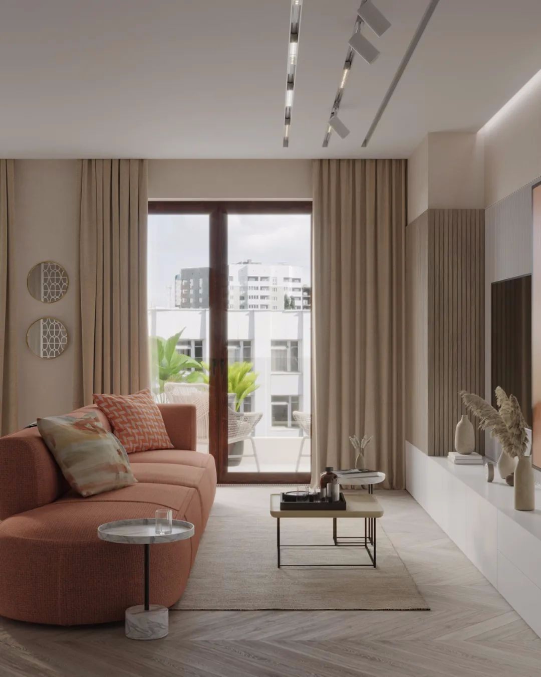 天花板采用平顶设计 在重点照明区域安装磁吸灯珠 可以使光线更为均匀柔和 电视背景则采用射灯洗墙的手法 提升空间造型的展示性