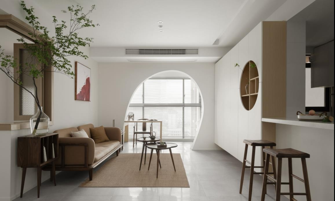 硬装的木作采用原木色+白色,软装则用黑胡桃深色提升质感。深+浅,轻+重的形式,空间的层次像写意画的笔触在宣纸上晕染开。移步移景,视线的停留之处皆是景。不规矩的方圆门,成为从餐厅的景墙转折到客厅阳台的亮点。