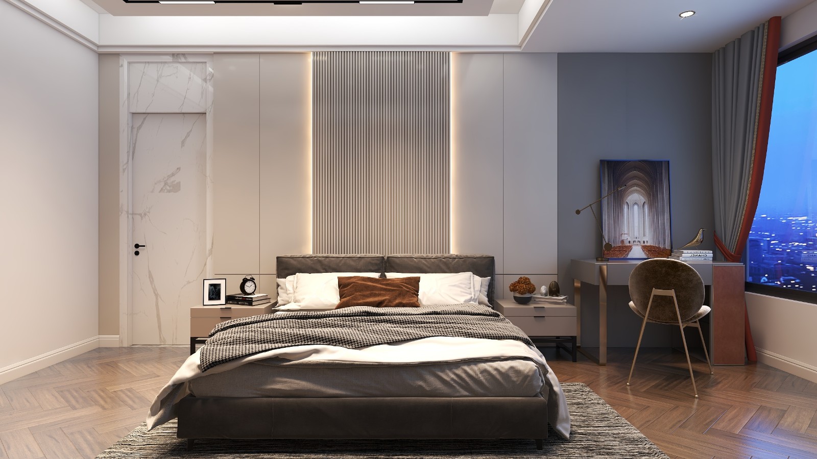 表面使用白面大理石材质与护墙板结合,与其他装饰展示有效结合起来。