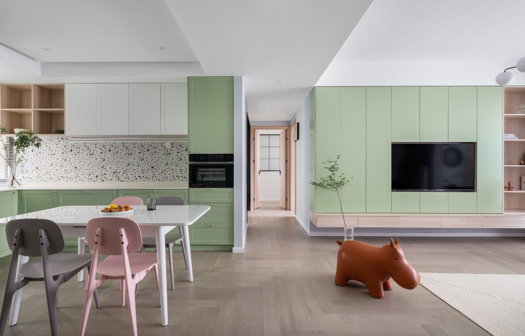 蒸烤箱提前确认好尺寸嵌入柜体,牛油果绿+水磨石元素的CP组合碰撞出无限的视觉惊喜,打造明媚欢快的就餐氛围。