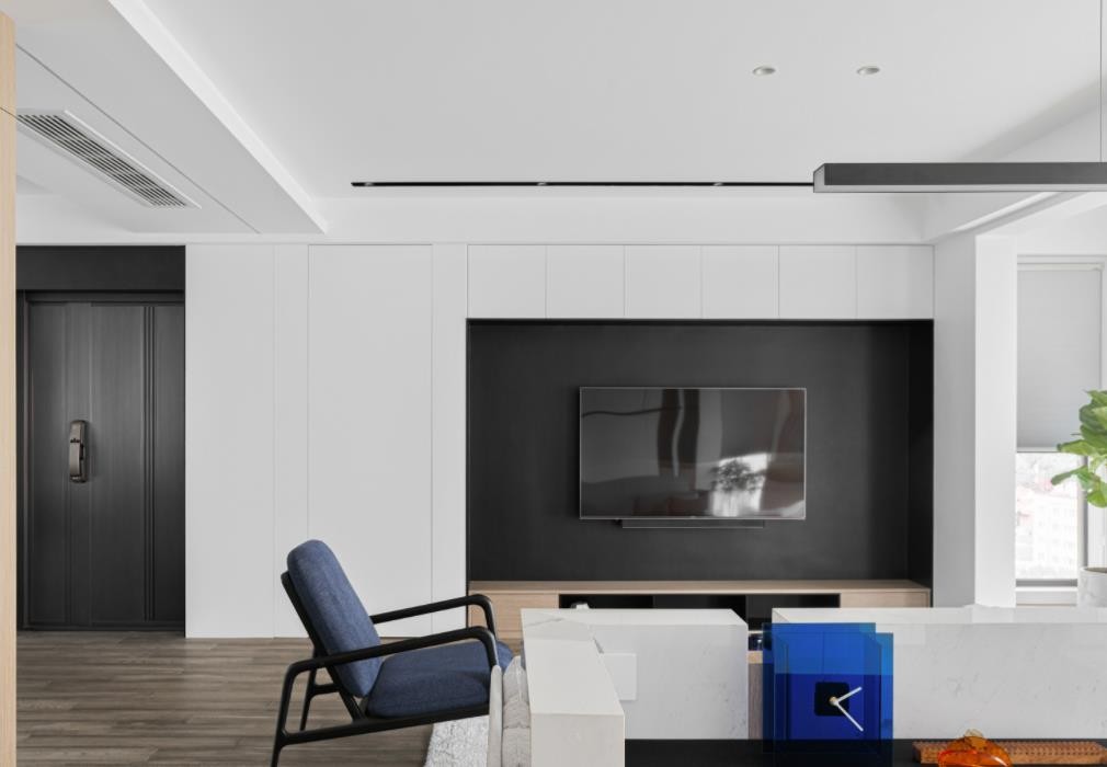 客厅整体以白、木为基础色,黑色电视背景墙及蓝色单椅为空间点缀,氛围舒适自然