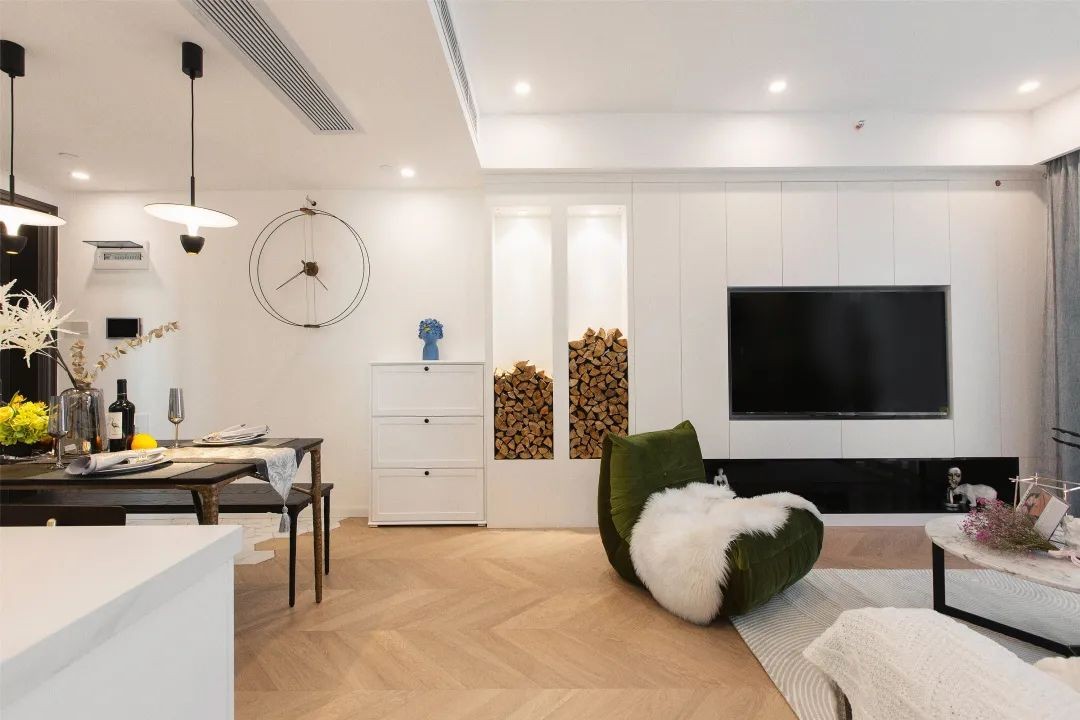 嵌入式电视背景墙,暗藏着巨大的储物空间。巧用黑白撞色在电视下方做了黑色的展示柜