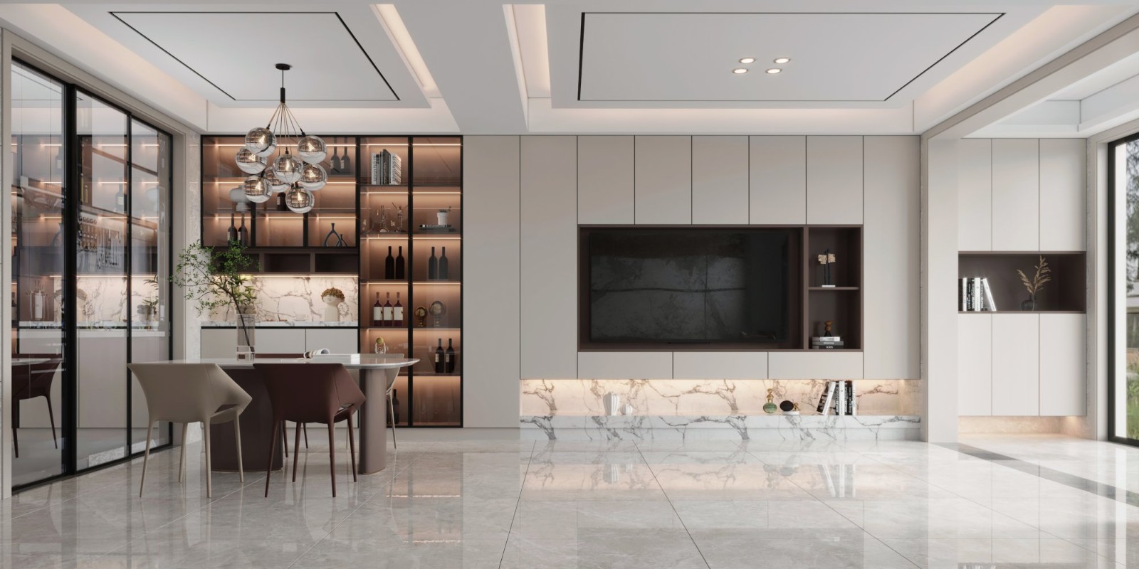 餐厅连接着厨房,利用玻璃门将两个空间隔断开,保障空间使用的独立性,定制的餐边柜搭配着顶部的多头吊灯,营造出一斤精致大气的用餐氛围。
