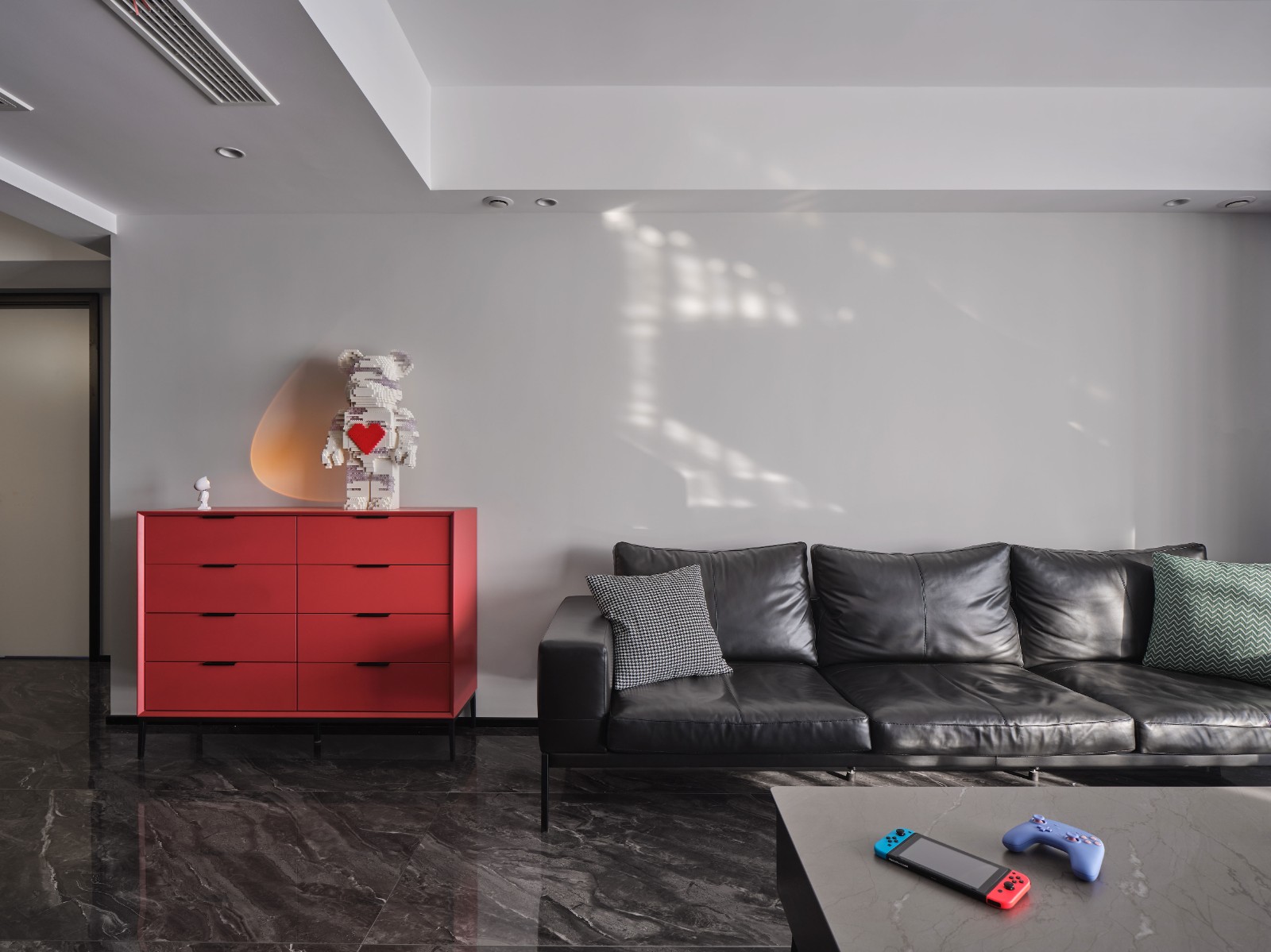 客厅以烟灰色为空间主色调,铺垫优雅沉静的氛围 黑色皮质沙发质感满满,而捎带烈焰的帕莎诺瓦红便是这个家独特的属性