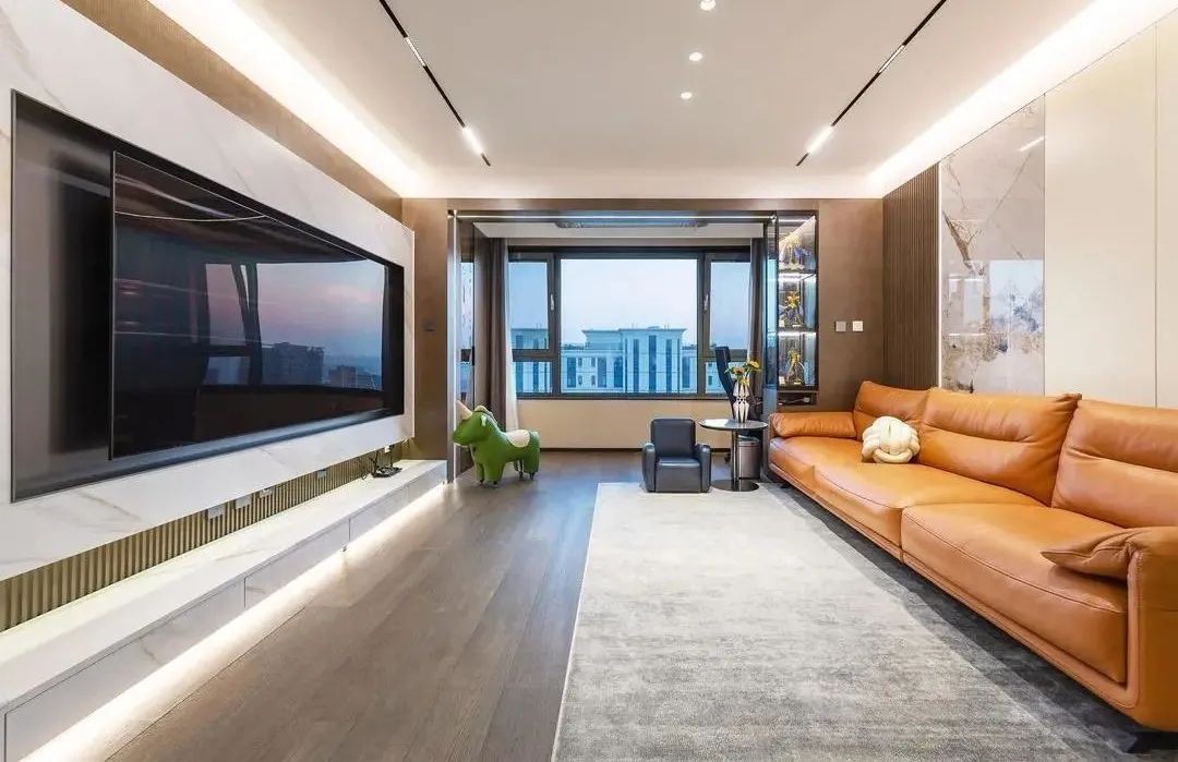 无茶几的设计增加了客厅的自由使用空间,大面积的深棕色地毯,小朋友的小木马,小座椅,这就是亲子活动的时间。四周深棕色木质墙板包围,客厅与阳台交界处整体使用线性灯带,酷炫而又有质感!沙发的右侧就是手办展示柜,完美融合其中