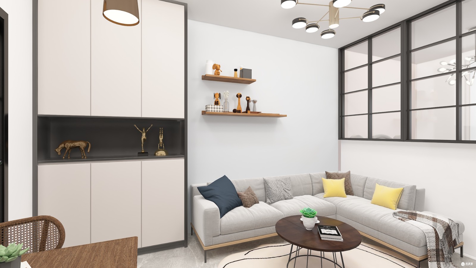 客厅空间小,用小甩尾沙发,旁边的储物柜方便收纳。