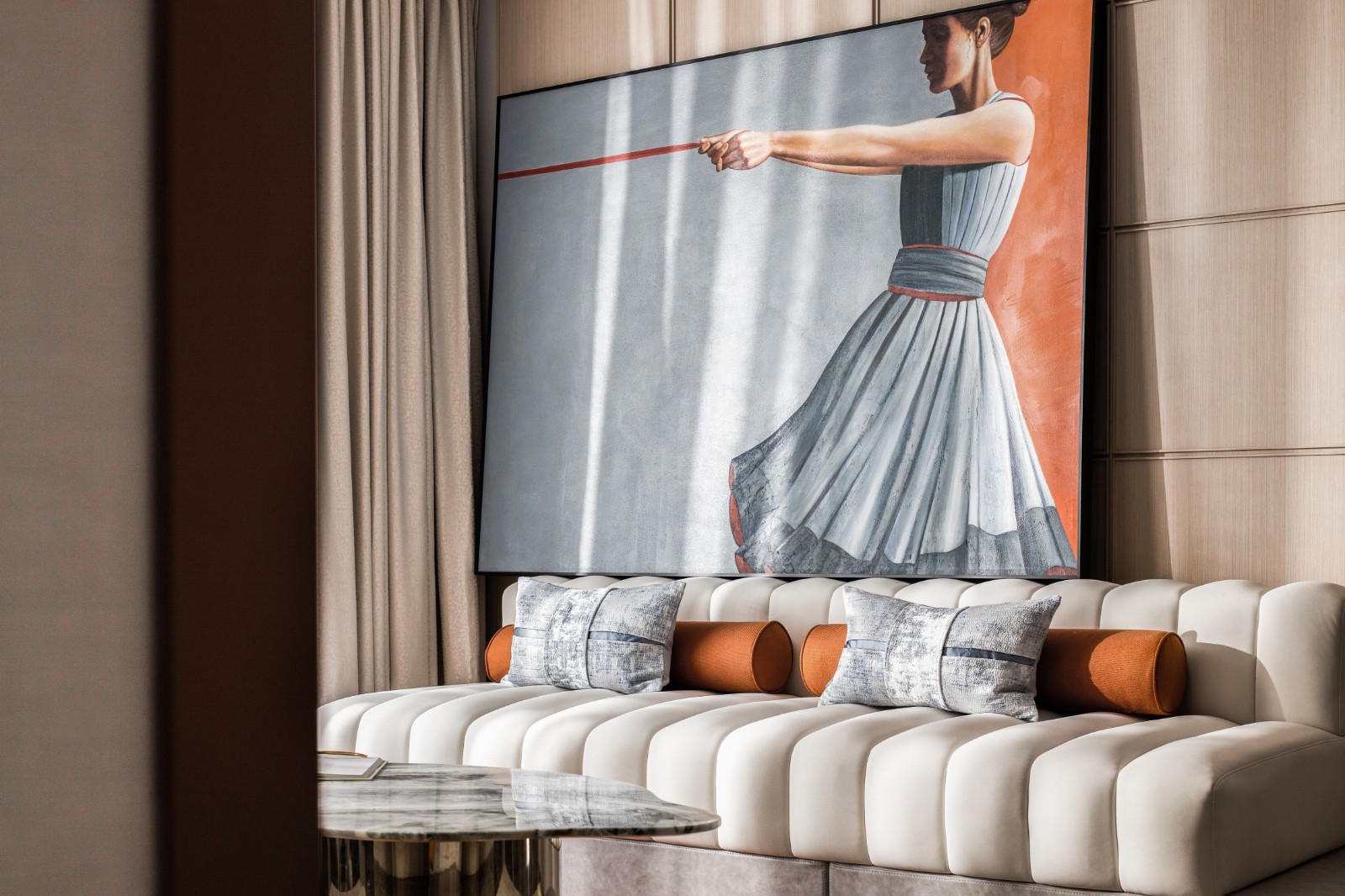 独具设计感的沙发抱枕、边桌、落地灯以及艺术摆件,看似随意置于空间之中,实则皆经过精心的设计考量,巧妙提升了空间的艺术调性。
