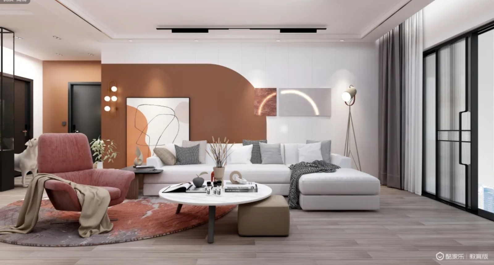 本方案以暖橘色系为主色调,让家的轻快氛围跃然浮现,采用富有弹性表面的漆面手法,以甜橙橘,玫瑰红温润基调,藉由切分出主从有别的灵动场景。艺术品摆设为空间拉出重心力度,加强和谐连贯的视觉动线。客餐厅一体的设计,使空间具有互动性。玻璃隔断分割活动区域,创造出交互空间。主卧采用地台设计,在行走中增强生活的仪式感,无主灯的设计营造不同的氛围感。