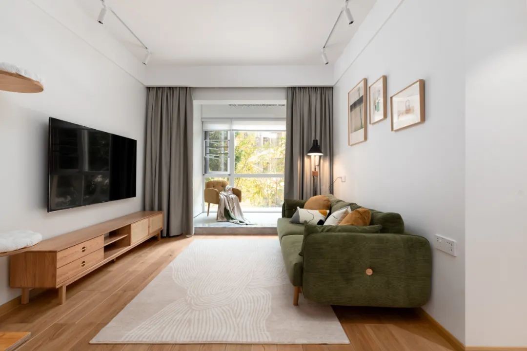 客厅没有摆放茶几,为屋主和猫猫提供了玩耍空间,原木搭配大面积米色地毯,营造出明朗的温馨感。 阳台进行封窗处理,阳台与客餐厅一体,扩大空间感。
