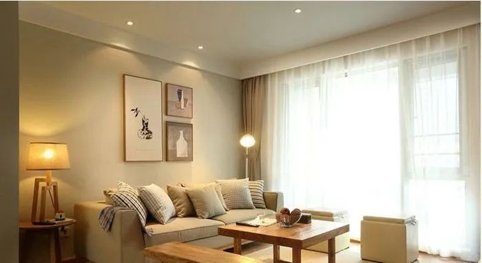 整个客厅铺贴软木地板,加上暖咖色墙面进行变色,平面吊顶加点光源设计。奶杏色布艺和木质结合的沙发搭配了两个木质条凳。两者搭配起协调美观,线条感也很强。