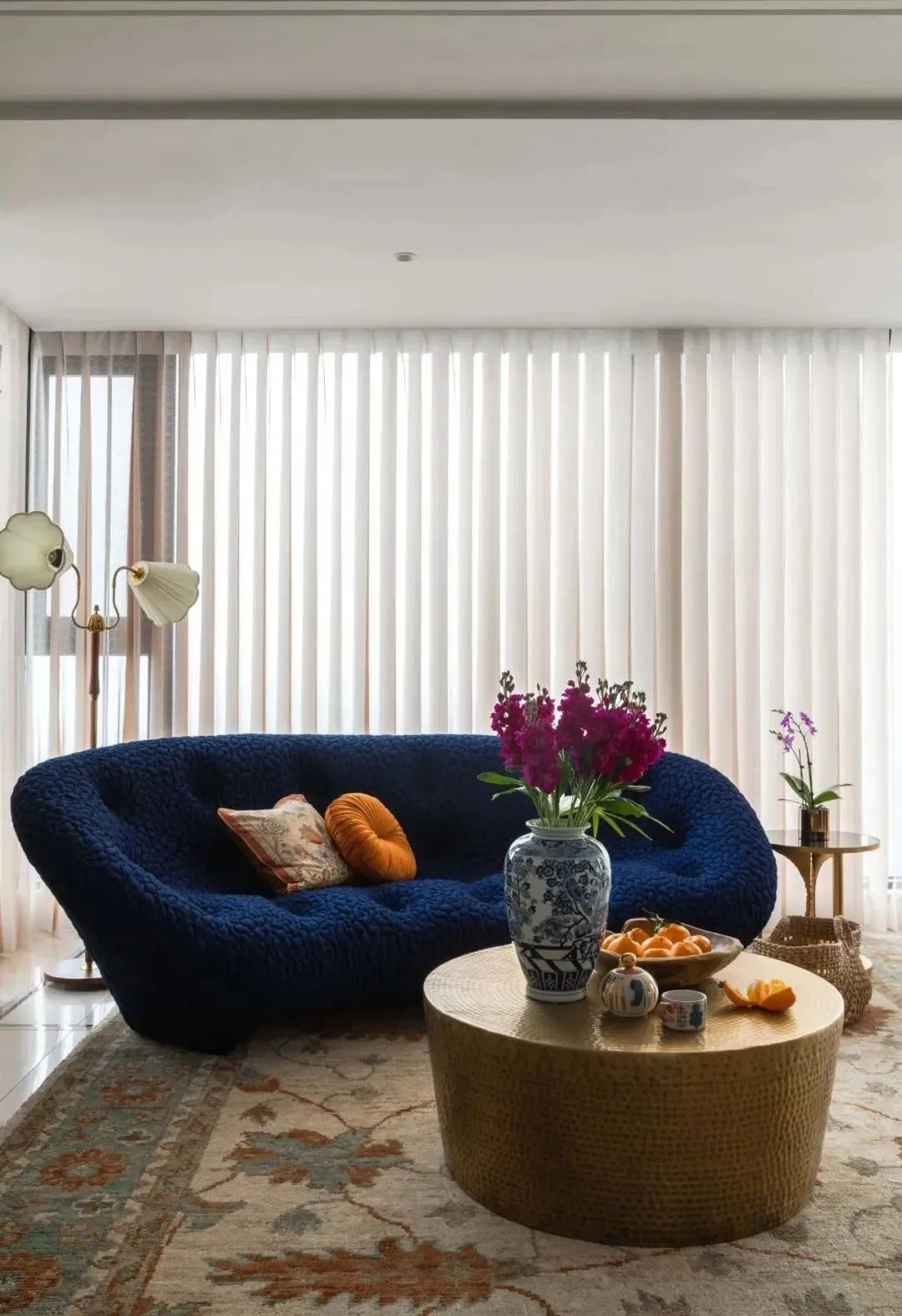 宝石蓝色的沙发非常吸睛,沙发上的抱枕也是专门挑选带有法式真丝花鸟纹图案的,搭配印度手工打造的黄铜茶几简直韵味十足。黄麻的大片花鸟的纹样,巨大的尺度也可以挡住难看的精装修地面。