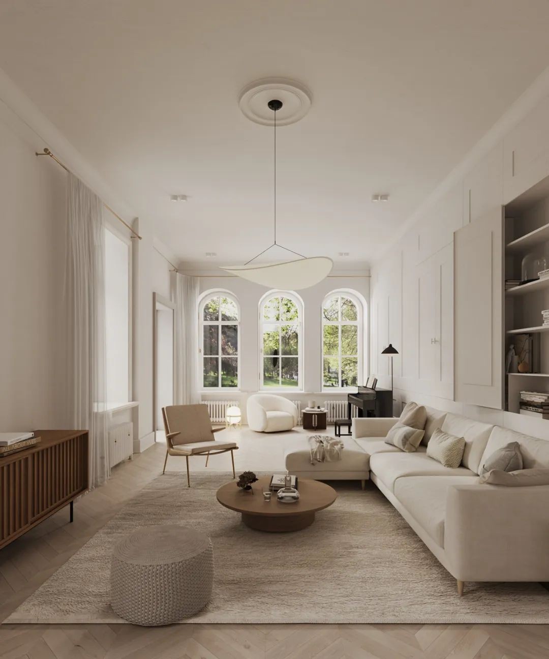 房子面积130㎡,漂亮的窗户的形状,天花板的高度为3.5米,以斯堪的纳维亚风格为设计基础,素雅色彩,低调且华丽。