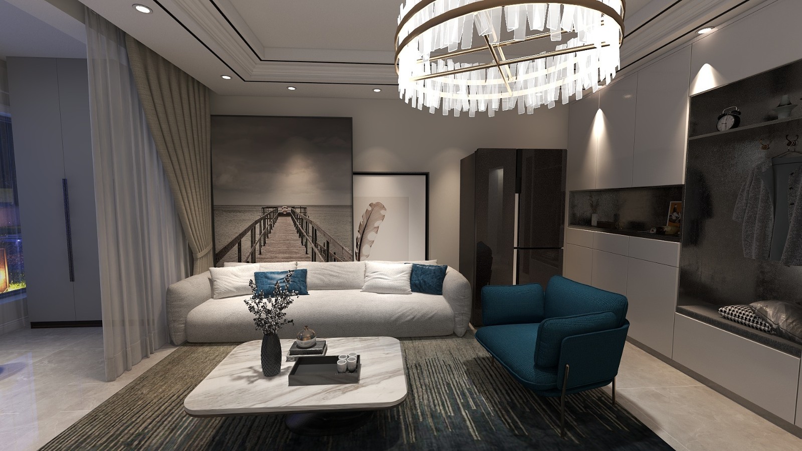 客厅区域设于三人位沙发和单人位沙发 旁设有冰箱 入户柜