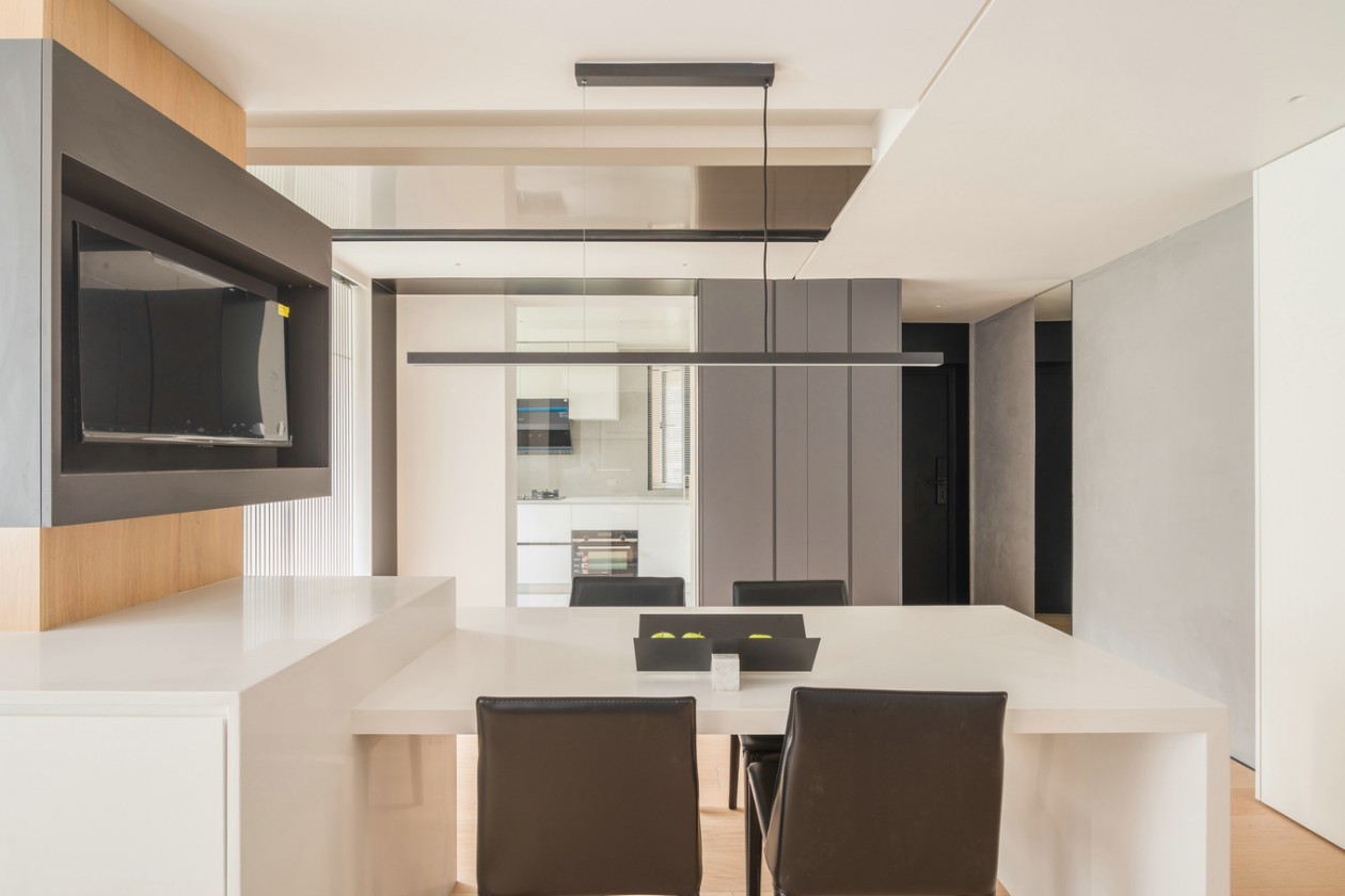 餐厨区是白配木色调下的现代极简。不过分太花哨、也不太清冷,通过美学设计方面的经验结合,将简约和品质之感相融合,孕育出清宁雅致之感。