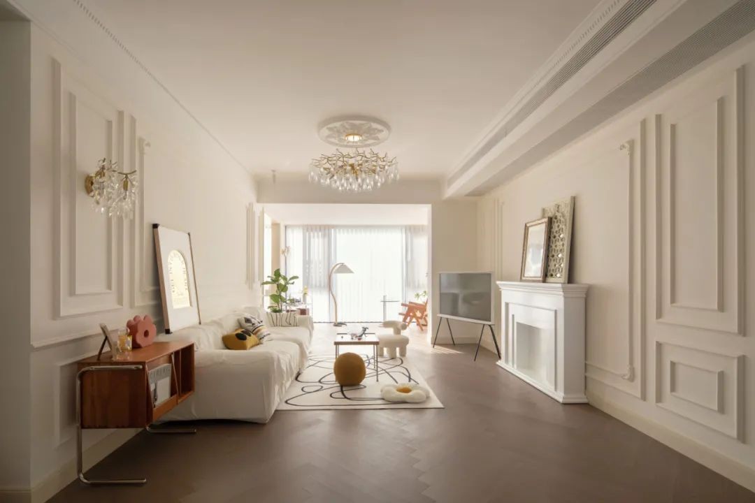 素净的石膏线搭配雕花,橡木色的鱼骨拼地板拉长了空间的纵深感。