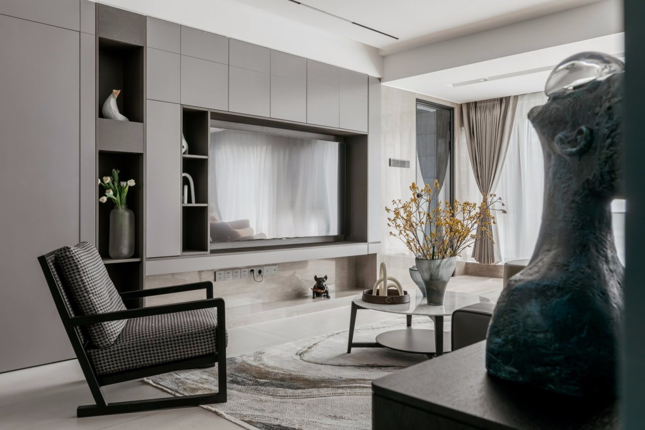 整个客厅以灰色作为基调,和谐统一,从进入空间的一刹那,视线毫无阻隔,大面积落地窗开阔明亮,电视背景收纳柜满足了功能与美感的协调,没有过多的造型和装饰,一切从简约出发。千鸟格扶手单椅,将永恒经典和时尚相结合。家具陈列考虑其必要性,力求让空间更加利落,将空间还给人,感受宽广的尺度和身体的舒展。
