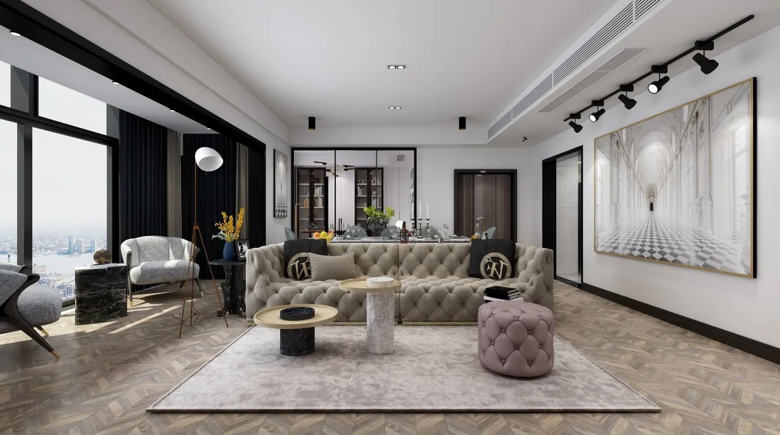 客厅硬装部分采用浅色设计,搭配黑色线条,形成对比
