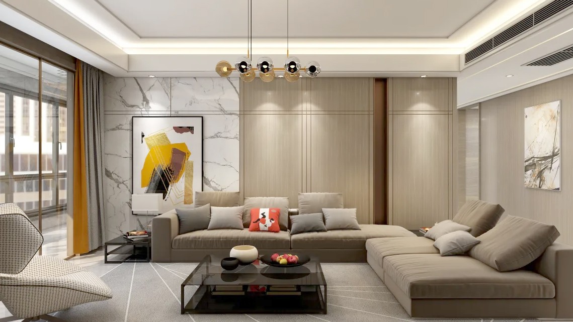 客厅采用大理石和木纹护墙板的搭配设计