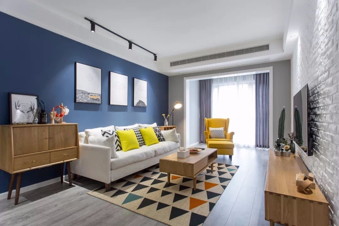 蓝色的情面搭配白色的沙发,一抹黄色点缀其中,让整个空间充满了活力