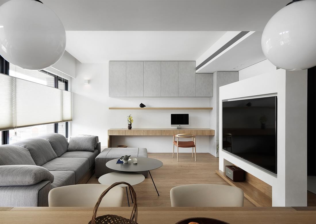 客厅的设计可谓是别有用心,一扇落地的大窗,灰色的沙发,宛如屏障一般的电视墙,原木色的小吧台与简单却又阔绰的餐区。将工作区设计成小吧台的样子,不仅是巧妙地增加更多可利用的空间,在方便屋主办公的同时又增加了工作的情调。