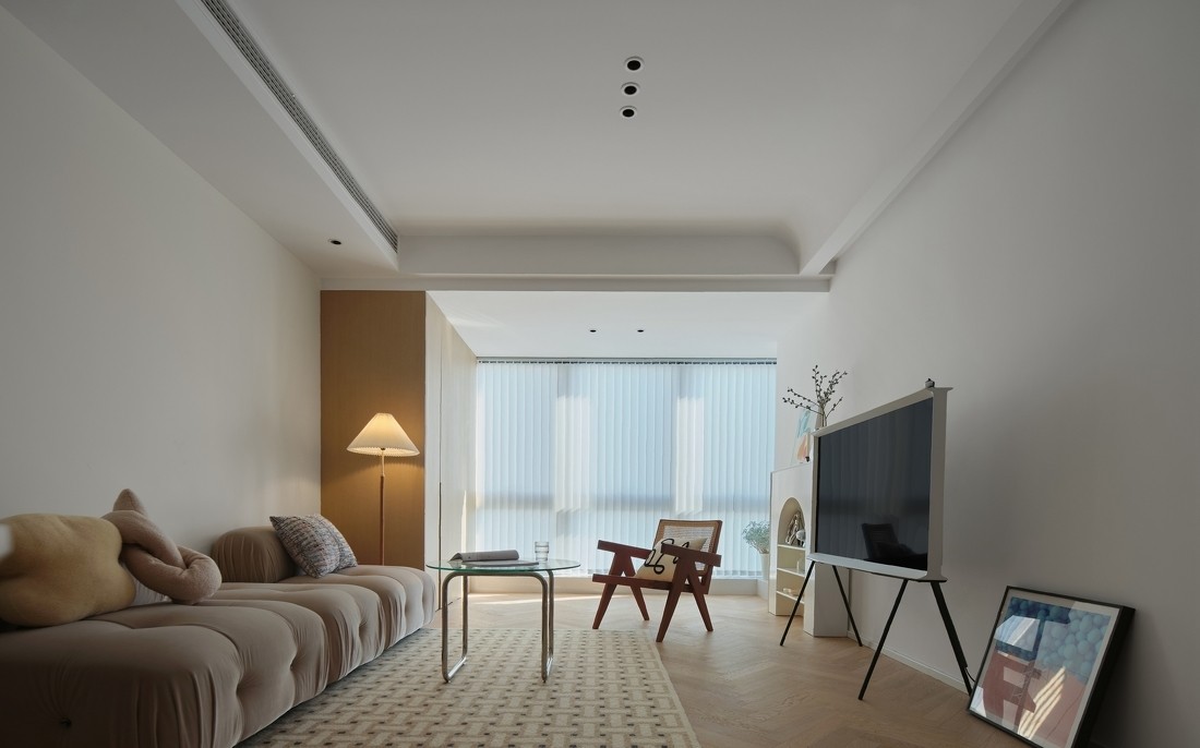 客厅空间在强调一种简洁与舒适,没有花哨的装饰和陈设,原木的质地让空间沉浸在柔和的氛围里。在功能结构上,将阳台纳入客厅并且在装饰材质上进行统一化处理,利用叠级吊顶弱化阳台梁体的问题,让两个空间合二为一。