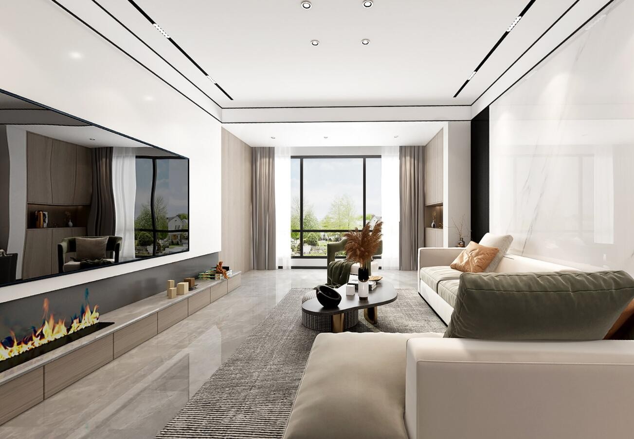 客厅采用无主灯的设计,隐藏的灯带与射灯使得空间的光线更为轻柔,白色的墙面砖搭配着白色的墙面漆,在阳光与灯光的照射下,显得干净大气。
