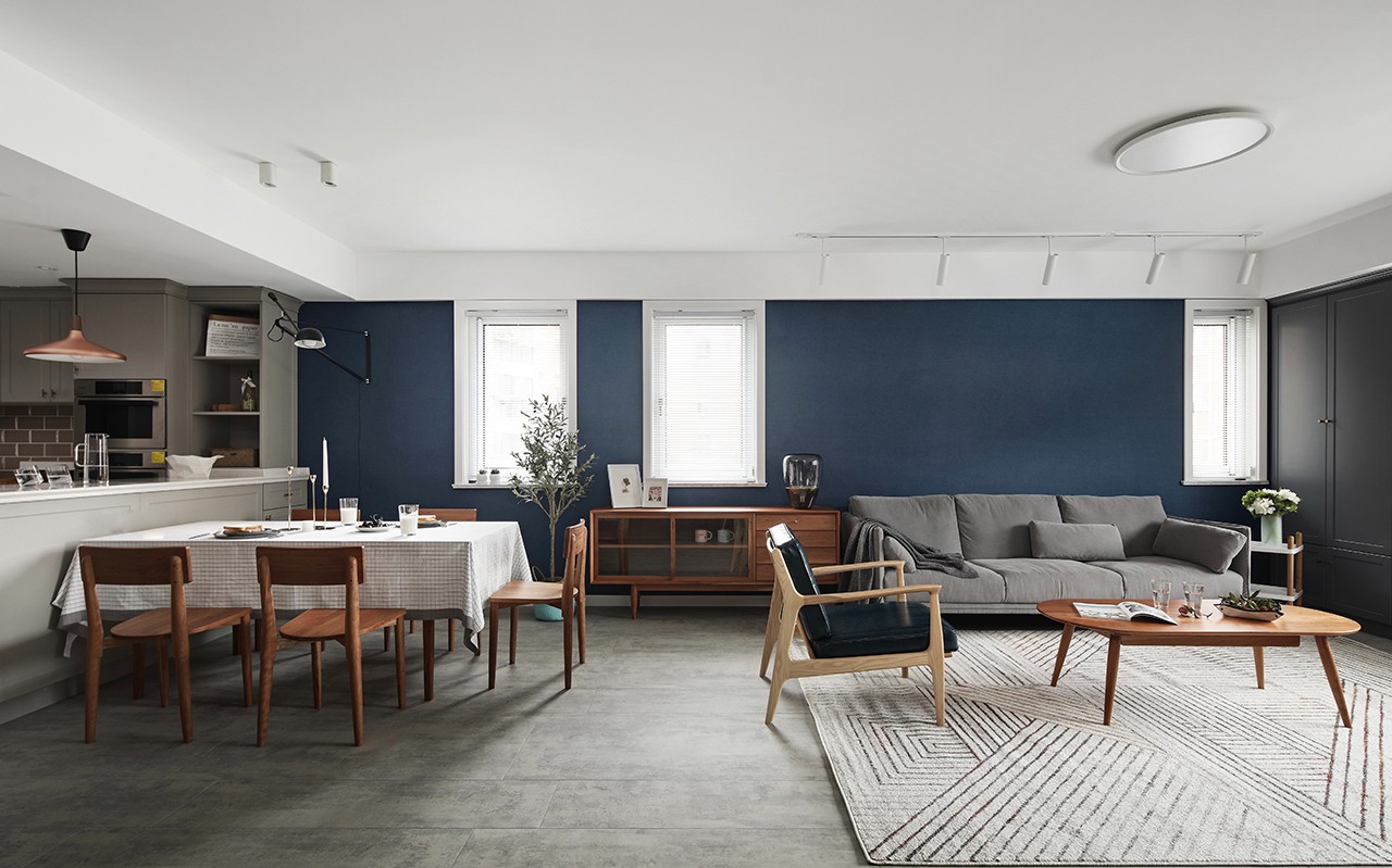 深蓝色背景墙搭配灰色沙发,绝绝子