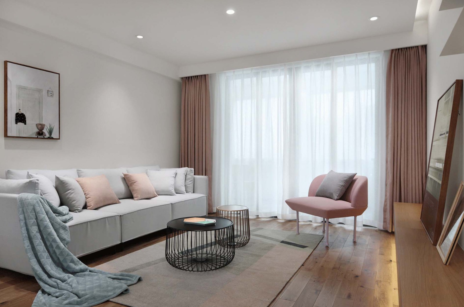 清新感满满的客厅,粉色调的软装增加氛围感~