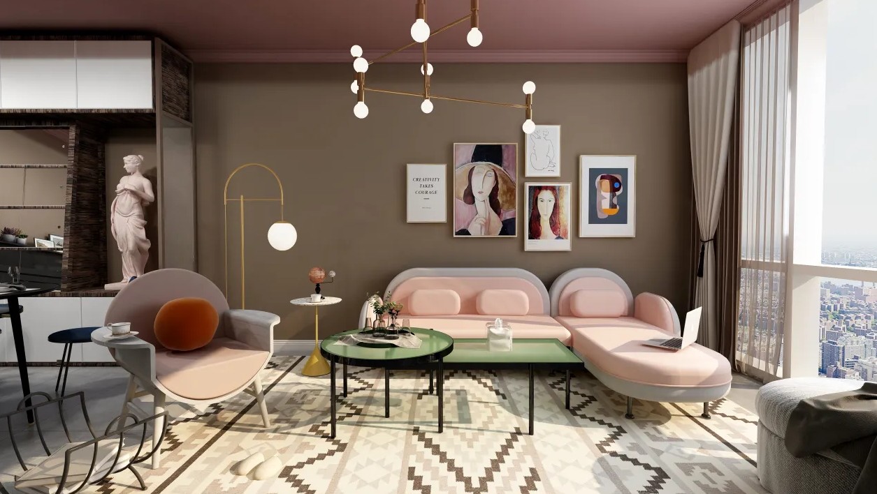 本案为复古混搭风客厅设计,整体的墙面采用深色,营造一种***优雅质感。采用拱形、圆形等几何元素,与金属、水磨石交叠呼应,丰富的材质与带有灰度的粉色大胆融为一体,为客厅空间带来流动的节奏和艺术气息。