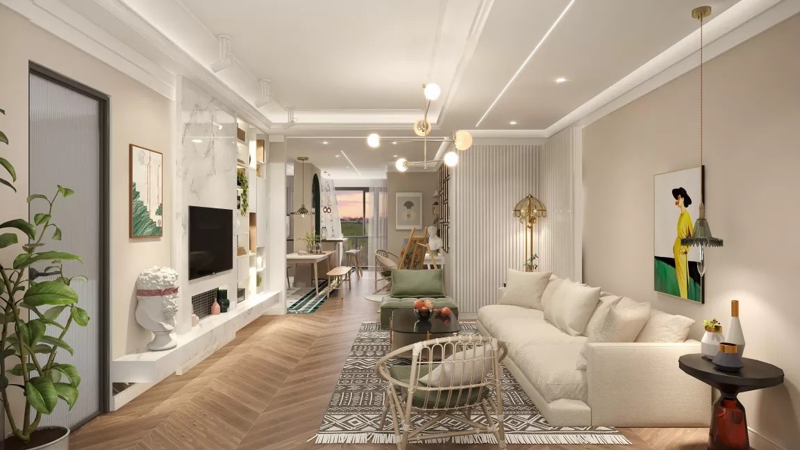 客厅全铺实木地板,搭配整天软装显得更加温馨。