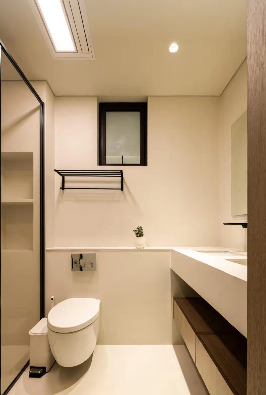 卫生间经平面改造,采用就近收纳空间,用灰色的砖以及黑色大理石拉开空间的对比,***却不失雅致。