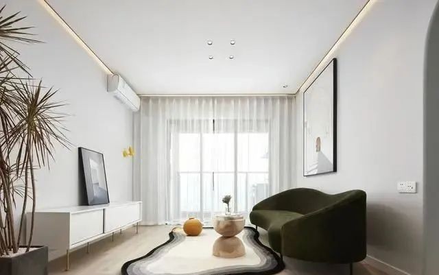 当然,由于空间比较小,所以空调也选择了普通的挂机。而整个客厅最吸引人的,应该就是地面的不规则造型地毯了,渐变色的饰面,看起来非常有特点,且与深绿色的沙发,起到了很好的平衡作用。