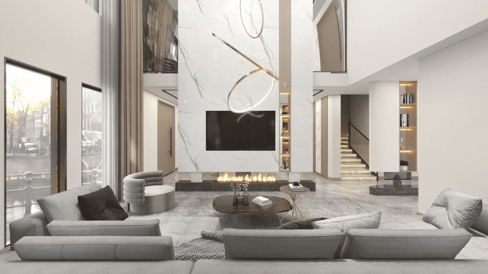 岩板作为空间的主导元素,从背景墙到地板全面贯穿,让客厅更具有整体感