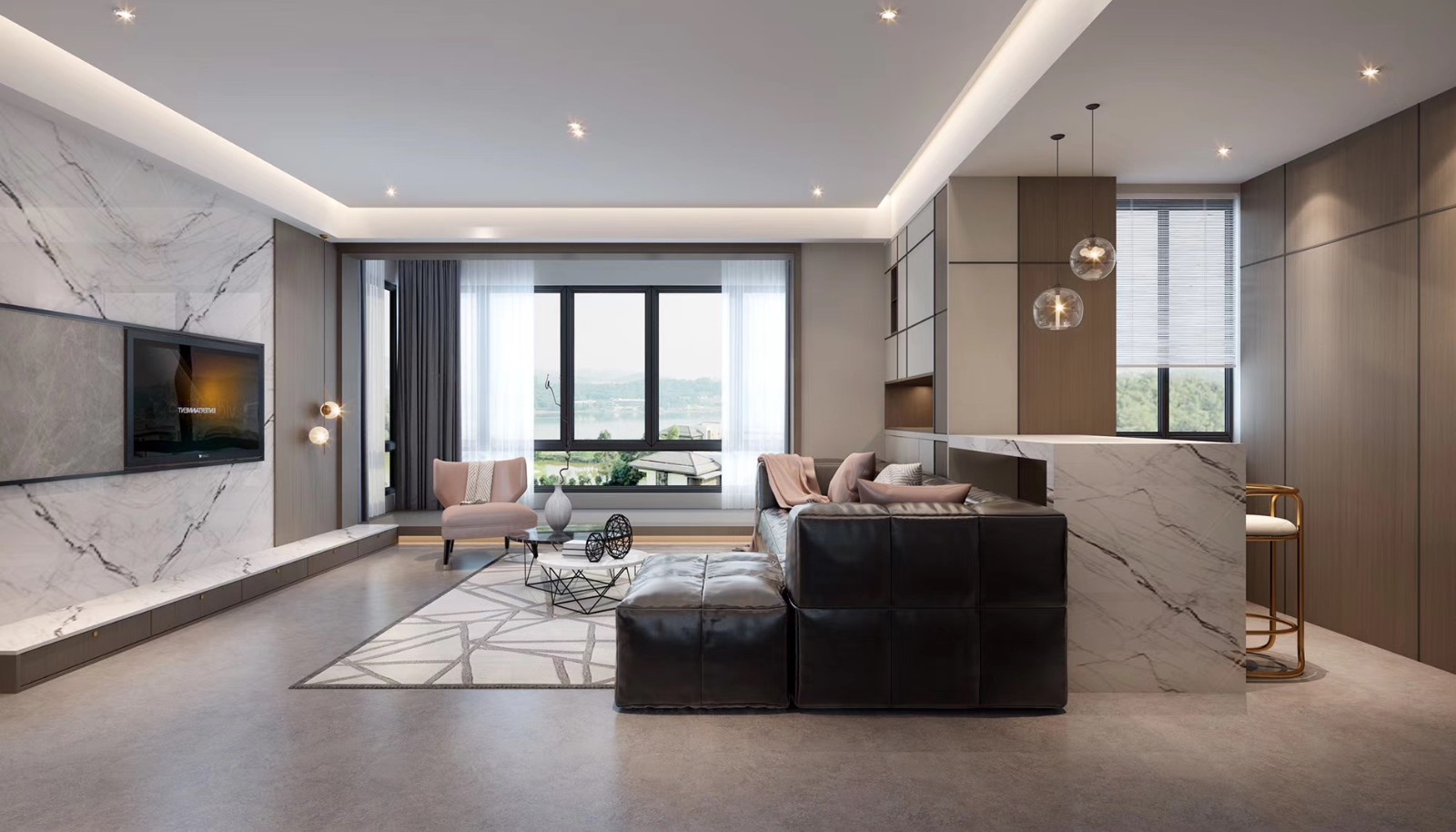 大飘窗引入室外光线,人与自然的对话在这里产生。雾起,窗外隐约朦胧,宛若天宫观云涌,蓬莱瑶台觅仙踪;雾散,风景明丽万物明朗,微风起处水轻皱,不解碧波因何忧。 无主灯设计,柔和的光线让空间显得气质盈盈,盛放一份静谧和温馨,让归家的心有所依;来自不同方位的光源,让空间没有暗角,层次感更加鲜明。