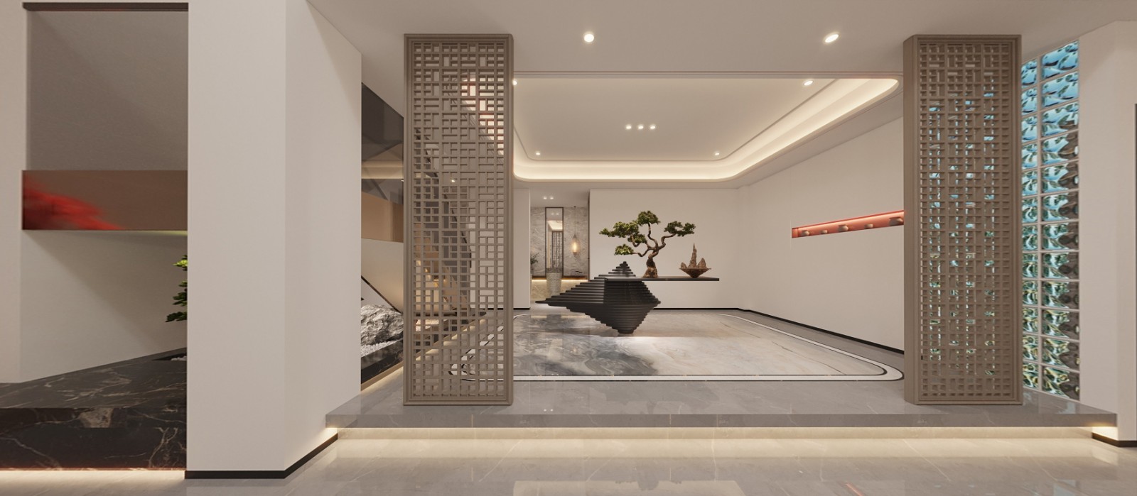门厅设计了很多亮点,特别是屏风隔断的装饰,以及墙面开槽处理,和玻璃砖墙面;