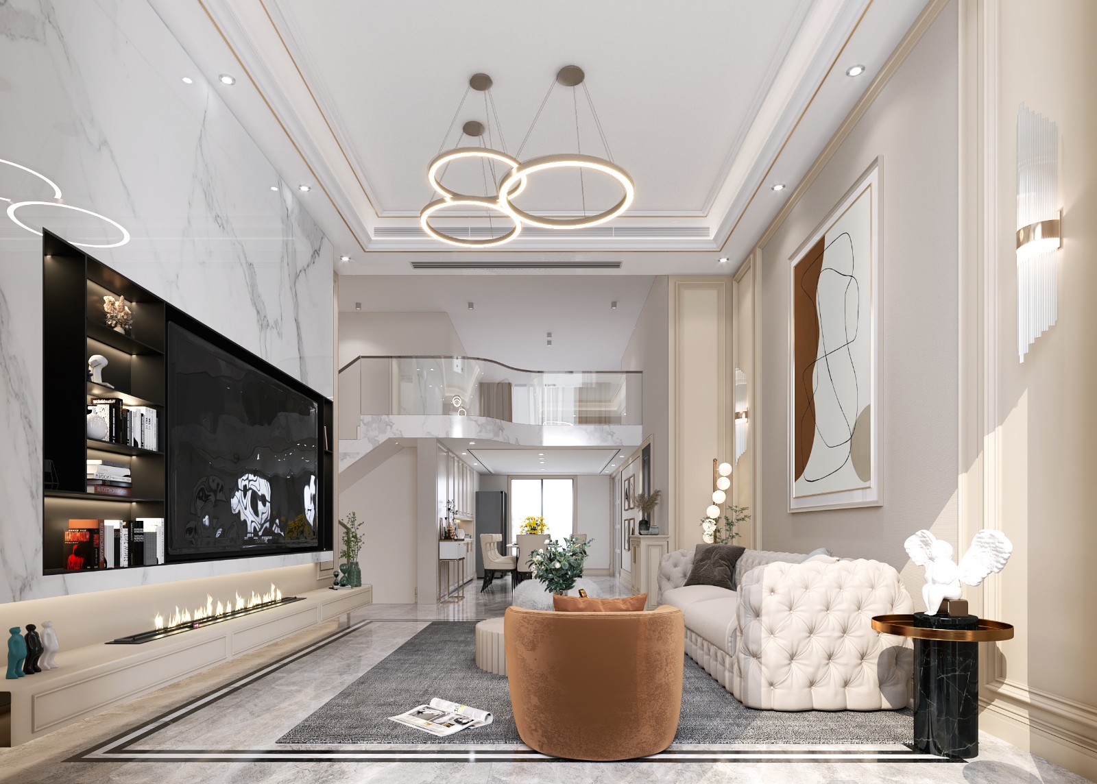 以白为主色调的现代轻奢家居,色彩与造型都塑造出轻盈通透的效果,在造型上更是加入石膏线、金边等细节,尽显轻奢美感。