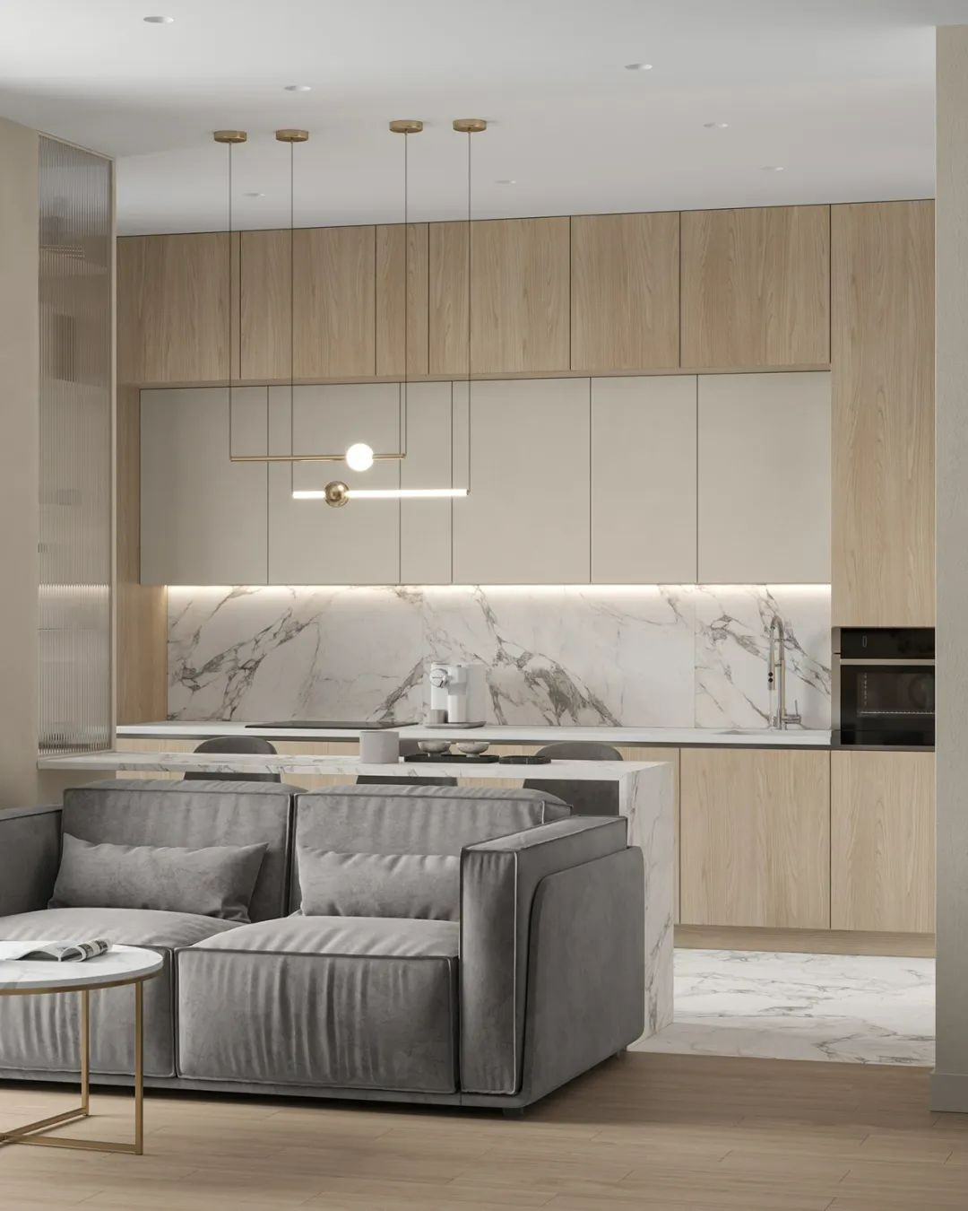 柔和的原木色调与奶白,形成了清晰的空间架构。