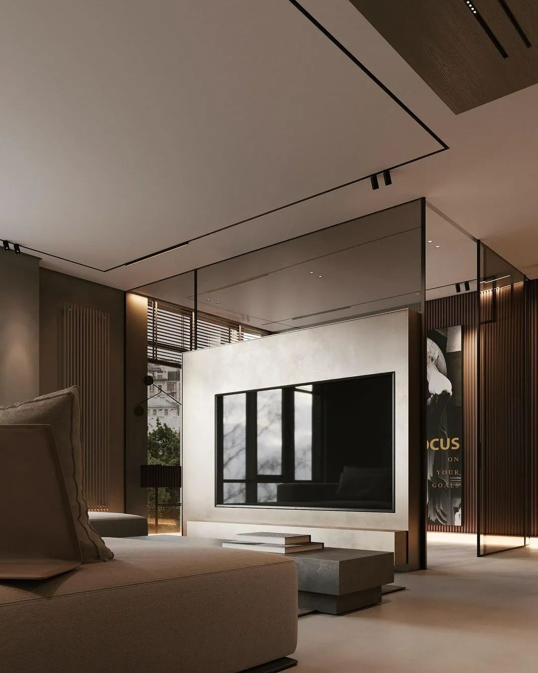 电视墙与咖色玻璃连接,将空间截断,构成了一处小而舒适的办公区域,不过面对窗子的工作台非常宽敞。巨幅绘画为这个房间增添了亮点,也是最为引人瞩目的部分。