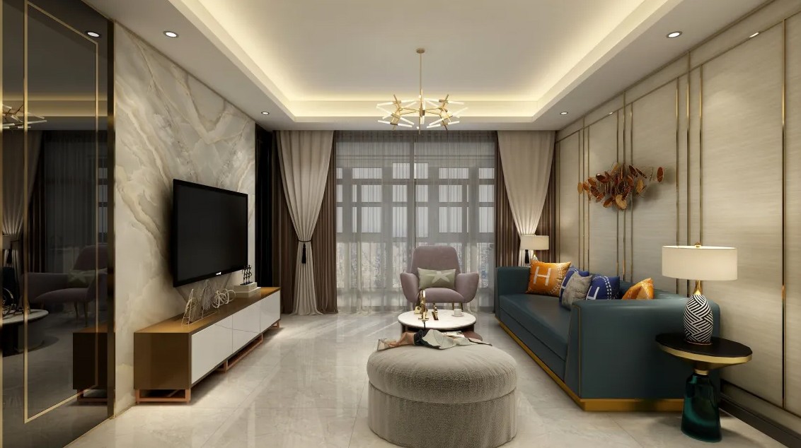 客厅硬装部分采用浅色设计,搭配金属线条,形成对比