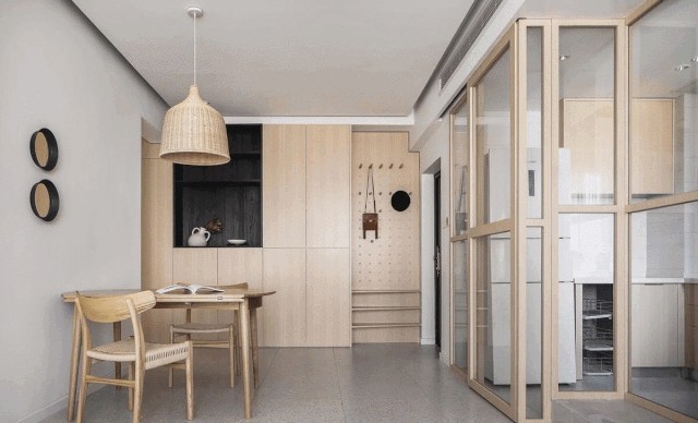 厨房与客厅之间放弃砖砌墙体用玻璃隔开,让视觉得到更大延伸空间体量更显大,两个空间的采光共享