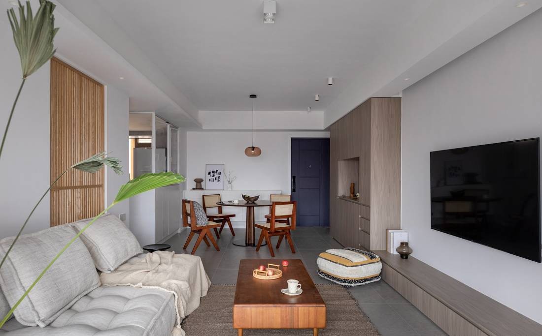 入户后LDK格局映入眼帘,考虑到动线灵活性,我们在餐厅软装上选择了二黑木作的胡桃木圆桌配合藤编椅作为生活的开场白,意为“团圆与相聚”,搭配一组L型白色餐边柜配合就餐人的生活习惯。