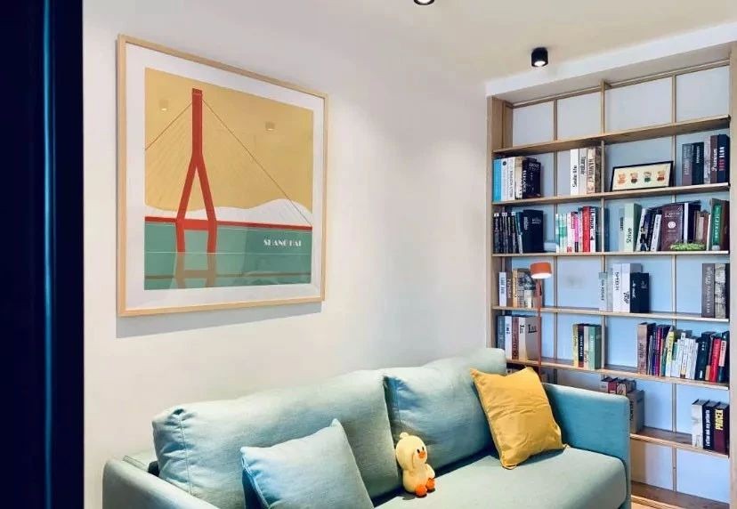 客厅靠厨房一侧打造的书架,既提供了收纳空间,还有效地分隔空间。