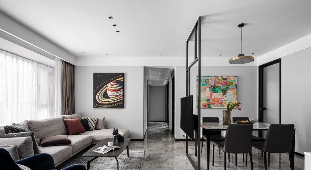 将临近客厅的小卧室拆除与公共空间合并,扩大使用面积。并利用与餐厅之间的空间制造了一处仅380mm宽、50mm厚的铁艺镂空电视墙,将客餐厅完美分区。