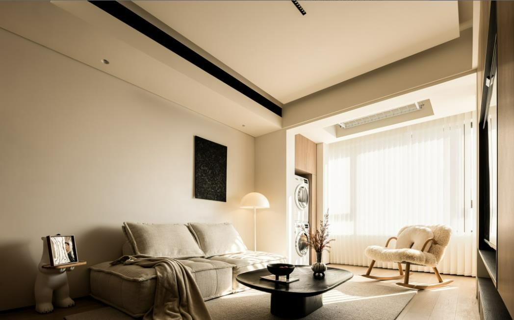 将阳台归入客厅,扩大空间的同时,更好的将自然光线引入室内,改造后的客厅尺度适宜,宽敞明亮。北欧表情的模块沙发,坐感舒适,颜值感人。 洗衣机干衣机,小米电动晾衣架