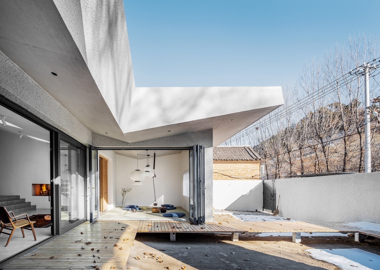 项目位于北京市中心以北约 60 公里,长城的山脚下,设计师被要求为一座闲置的乡间房屋增加适当的扩建部分。 将现存建筑的屋顶延伸,额外增加了120平方米的居住面积。 新建部分的地面更贴近户外花园,通过高度差有意将用餐区和起居室分隔开来。新建的斜屋面覆盖了核心的公共空间,并在东侧和西侧延伸出来,形成一个茶室和一个小型spa房。