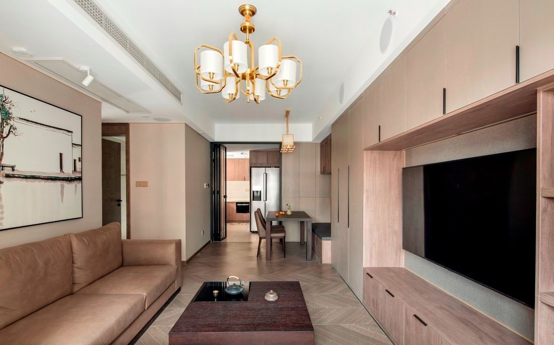 走廊尽头原是卧室门洞,经过合理的动线规划,在进行结构改造时我们将这个弊端规避掉。采用鱼骨拼地板铺贴上墙,让视线从地面延伸至墙面。同时顶面配置有暗藏灯带,进行饰面点缀与强化。 没有繁琐的制式,每一处设计的考量都以人的感受为出发点,保留中式的灵魂,注入当下生活的元素,取其形、表其意