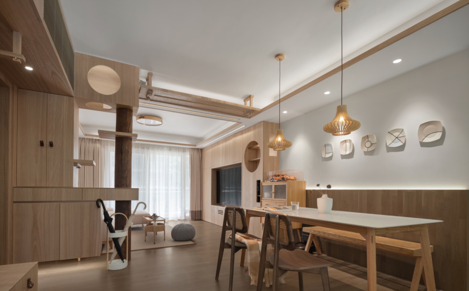 换鞋凳,玄关柜,猫的动线通过原木柱木头串联起来,悬浮的功能结构加上灯光氛围的营造,实现功能和形式美感的完美结合!