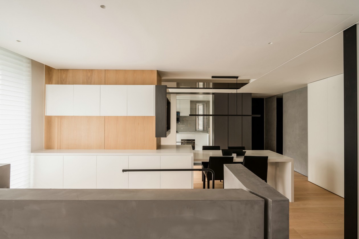 半围合式清水混泥半墙取代了客厅和原次卧之间的墙面,整个空间透亮无碍,无论是在客厅、餐厅还是书挡,都能看到忙碌而幸福的家人。